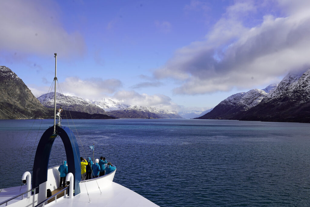 Die „SH Vega“ hat die Küste von Grönland erreicht. Also nichts wie raus aufs Außendeck. Der Wind pfeift. Ein Schwall kalter Luft trifft aufs Gesicht und vertreibt die letzte Müdigkeit. Eisschollen schwimmen dem Schiff entgegen und dann liegt Grönland vor uns. Die größte Insel der Welt. 80 Prozent sind von Inlandeis bedeckt. Von Norden bis Süden erstreckt sich das Eis über 2.600 Kilometer – so weit wie von Norddeutschland bis in das nördliche Afrika. Hier schneit es von Oktober bis Mai und an manchen Tagen fällt die Temperatur auf minus 40 Grad. Aber so weit ist es heute noch nicht. Mit dem Parka, den das Kreuzfahrtunternehmen Swan Hellenic jedem Gast schenkt, ist man warm genug angezogen. Obwohl es so früh ist, kommen mehr und mehr Passagiere an die Reling. Ausgerüstet mit Ferngläsern und Kameras begrüßen sie den ersten Morgen in der Arktis. Und werden prompt belohnt. 200 Meter neben dem Schiff taucht ein Finnwal auf. Wenig später die Fluke eines Buckelwals.