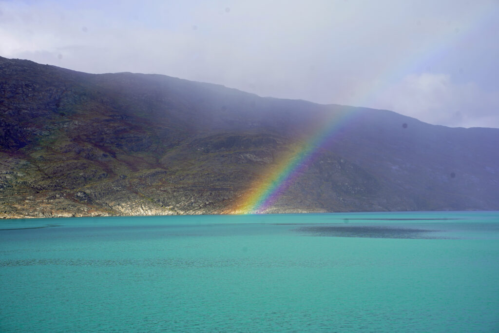 Die See ist glatt wie ein Spiegel, als wir am letzten Tag durch den Kangerlussuaq Fjord fahren. Henri Leinfelder hält einen Vortrag über Außerirdische in der Observation Lounge. Die Sonne scheint und eine kleine Wolke lässt ein paar Tropfen aufs Außendeck fallen. Dann taucht plötzlich ein Regenbogen direkt neben uns ins türkisfarbene Wasser ein. Vielleicht gibt es irgendwo eine andere Welt, auf der man leben könnte. Aber ganz ehrlich? Schöner als unsere kann sie nicht sein.
