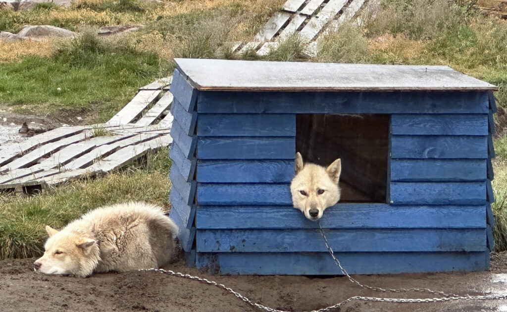 Wir passieren die Stadt der Hunde. Rund tausend Schlittenhunde leben hier. Ihr Geheul ist von weitem zu hören. Bald tauchen sie am Straßenrand auf, angebunden an kleine Hütten, zusammengerollt im Gras, aufgeregt winselnd oder völlig teilnahmslos, den Kopf auf den Pfoten. Nur die Welpen dürfen frei herumlaufen, bis sie ein halbes Jahr alt sind, dann werden auch sie angebunden.