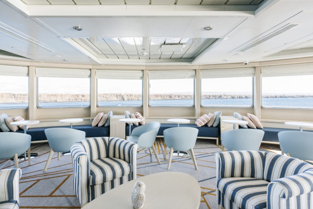 Mit großer Glasfront und Blick auf den vorderen Teil des Schiffes ist die Expedition Lounge ein fantastischer Ort, um die Schönheit der Galapagos-Inseln vom Schiff aus zu bewundern. In den beiden Whirlpools auf dem Expedition Deck genießen jeweils bis zu fünf Gäste eine entspannte Auszeit. Das großzügige Sky Deck bietet Bereiche, in denen die Gäste sich entspannen und die Sonne ganz oben auf dem Schiff genießen können. Hier befindet sich auch der Fitnessraum mit Yogamatten, Gewichten, 2 Laufbändern, 2 Fitnessrädern und einem Ellipsentrainer. Im Science Center werden Beobachtungen diskutiert, Finkenarten verglichen und viele Fragen gestellt. Durch die begrenzte Passagierzahl entsteht eine Atmosphäre, in der man sich schnell beim Vornamen kennt. Naturführer, Meeresbiologen, Fotografen und Passagiere sitzen abends gemeinsam in der Panorama Lounge, hier entstehen Gespräche, die das Erlebnis nachhaltig prägen.