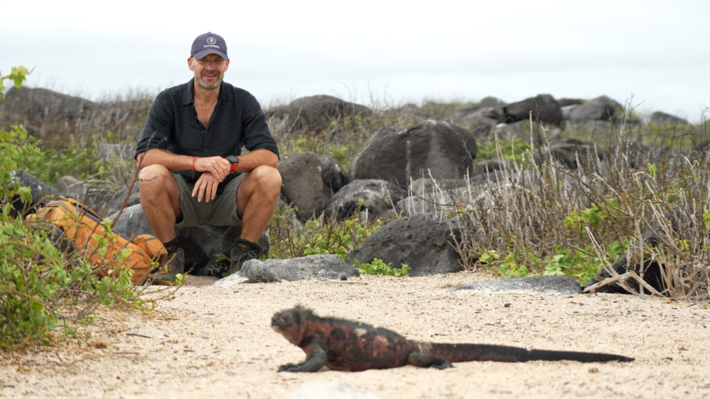 Baltra, wo es auf die Santa Cruz II geht, wirkt auf den ersten Blick karg. Flach und trocken, Kakteenlandschaften, Salzbüsche, staubiger Boden und doch beginnt hier das Staunen. Schon auf der kurzen Fahrt zum Schiff huschen Lavaechsen über den Weg, Pelikane ziehen in Formation über das Wasser während Blaufußtölpel unbeholfen an den Stränden landen. Es ist, als würde die Natur leise andeuten, was noch folgt. Der nächste Stopp, Fernandina, gilt als eine der ursprünglichsten Inseln des Archipels, menschenleer, wild und dennoch voller Leben. Auf den schwarzen Lavaflächen liegen Meerechsen dicht an dicht, speichern die abstrahlende Wärme des Gesteins. Sie sind die einzigen Echsen der Welt, die im Meer nach Algen tauchen, ein Paradebeispiel evolutionärer Anpassung.